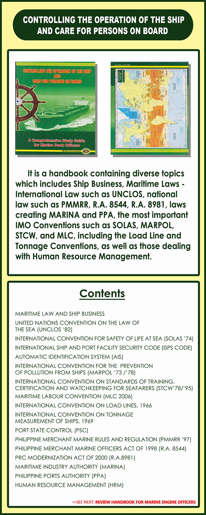 These handbooks were painstakingly prepared and distinctly designed for the benefit of the Filipino Seafarers, as part of a noble objective, to be of help in the upgrading of maritime education and skills development.